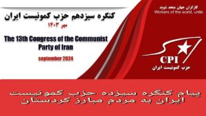 خیزش انقلابی ژینا و شعار رهائی بخش آن “زن، زندگی، آزادی” چون مشعلی درخشان، اتحاد و یک شورمندی آینده نگرانه را بر فضای کنگره سیزده حزب کمونیست ایران غالب کرده بود. در چنان فضائی مبارزات فداکارانه چند دهه شما علیه جمهوری اسلامی مورد ستایش قرار گرفت، مبارزاتی که زمینه ساز شروع خیزش انقلابی ژینا گردید. ترکیب تظاهرات هوشمندانه خیابانی، با تاکتیک اعتصاب های پیروزمند عمومی، پیشروی به موقع و عقب نشینی آگاهانه ، همه اینها نشانه بلوغ سیاسی جامعه کردستان و از نقاط درخشانی است که از میزان آگاهی، صبر انقلابی، سازمان یافتگی و رزمندگی شما حکایت دارد. همین واقعیات سبب شد که مبارزین و انقلابیون از سراسر ایران همبستگی رزمنده شما با مبارزات سراسری را گرامی بدارند.