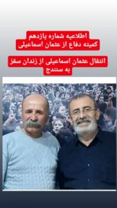 صبح روز دوشنبه 23 بهمن ماه مطلع شدیم که عثمان اسماعیلی را از زندان مرکزی سقز به سنندج انتقال داده اند. پس از پیگیری خانواده؛ یکی از مسئولین زندان مرکزی سقز گفته، وی را برای انجام آزمایشات و شروع مراحل درمان به پزشکی قانونی سنندج انتقال داده اند. انتقال آقای اسماعیلی به سنندج کاملا مخفیانه صورت گرفته و تا کنون خانواده و کمیته دفاع از ایشان از نحوه انتقال و محل نگهداری وی اطلاعی ندارند، که آیا قرار است در یکی از مراکز درمانی سنندج بستری شوند؟ یا اینکه صرفا برای انجام آزمایشات به پزشکی قانونی سنندج انتقال یافته اند.
