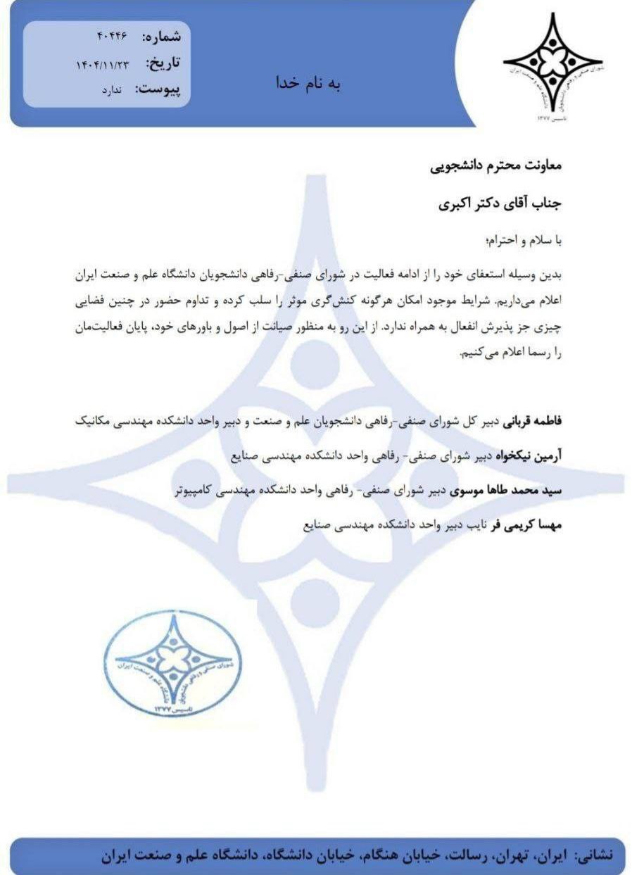 چهار نفر از اعضای شورای صنفی ـ رفاهی دانشجویان دانشگاه علم و صنعت ایران با صدور بیانیهای مشترک، استعفای دستهجمعی خود را اعلام کردند.