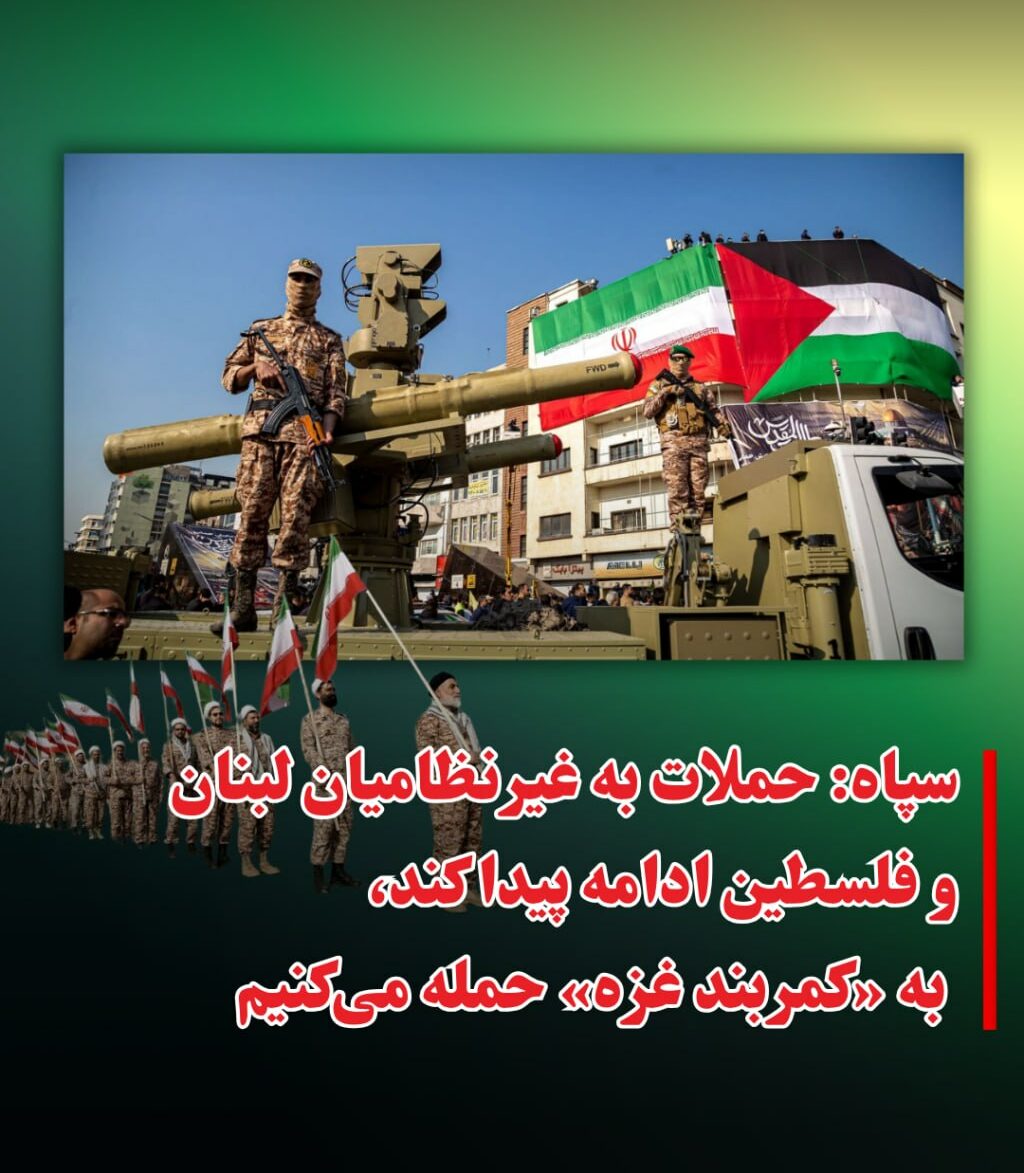 سپاه پاسداران در بیانیهای هشدار داد در صورت ادامه حملات به غیرنظامیان در لبنان و سرزمینهای فلسطینی، مناطق شمالی اسرائیل و کمربند غزه را هدف حملات سنگین قرار خواهد داد.