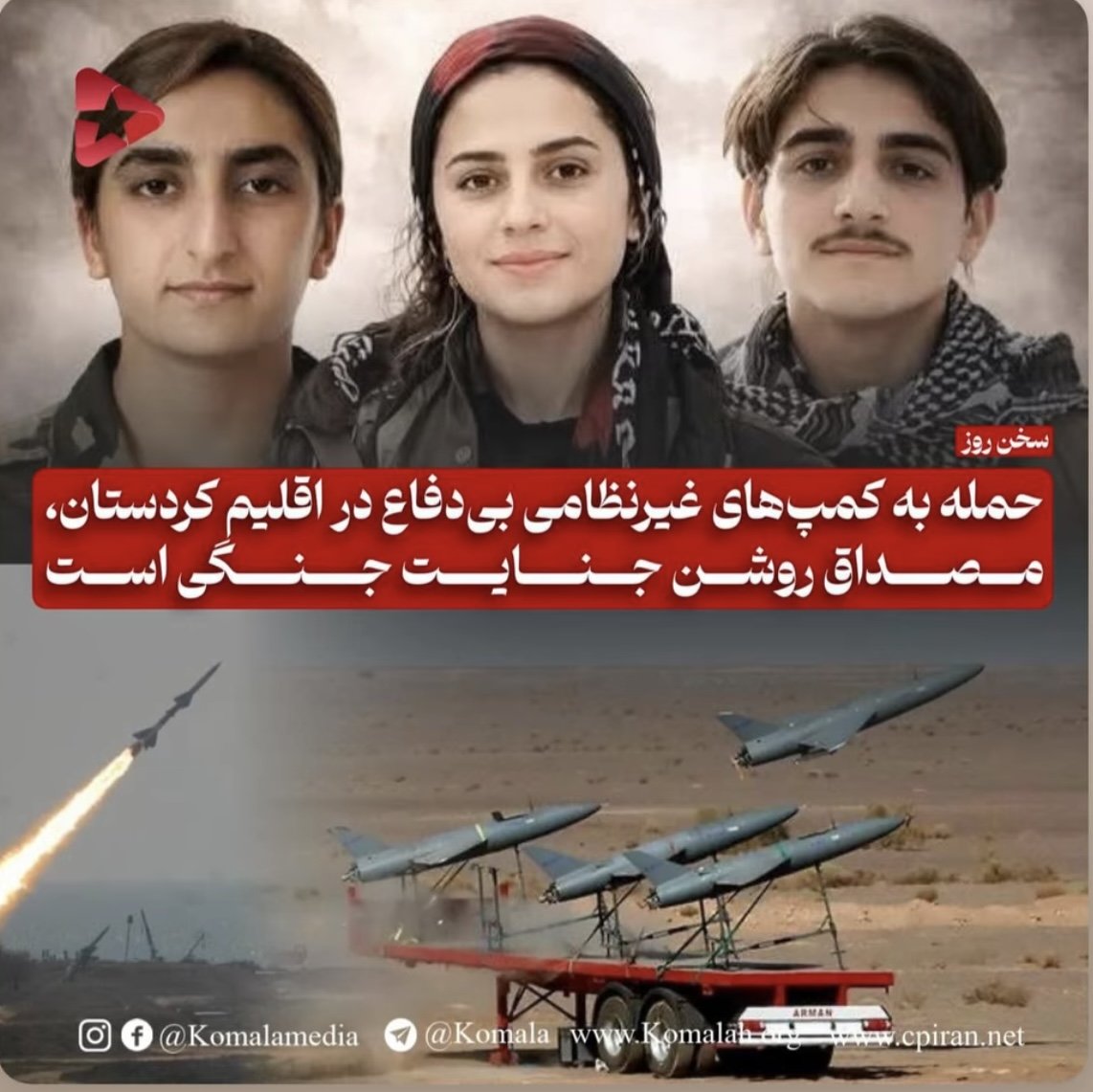 حمله به کمپ‌های غیرنظامی بی‌دفاع در اقلیم کردستان، حمله به انسان‌های بی‌پناه و مصداق روشن جنایت جنگی است. این جنایت نه فراموش خواهد شد و نه باید بی‌پاسخ بماند. دفاع از جان پناهندگان، خانواده‌های فعالان سیاسی و مردم بی‌دفاع، یک وظیفه فوری انسانی و سیاسی است.