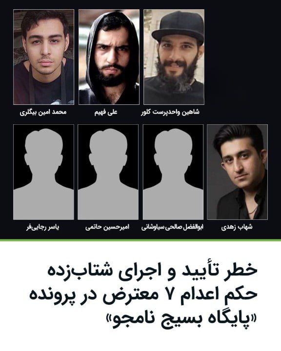 هویت این زندانیان: “محمدامین بیگلری، شاهین واحدپرست کلور، شهاب زهدی، ابوالفضل صالحی سیاوشانی، امیرحسین حاتمی، یاسر رجاییفر و علی فهیم”اعلام شده است. بر اساس کیفرخواست صادره، اتهامات منتسب به این افراد شامل “محاربه”، “افساد فیالارض”، “تحریق اموال عمومی” و “اجتماع و تبانی علیه امنیت داخلی و خارجی” عنوان شده است. با توجه به سوابق برخی پروندههای مشابه، نگرانیهایی درباره احتمال تأیید سریع احکام و اجرای قریبالوقوع آنها مطرح شده است.