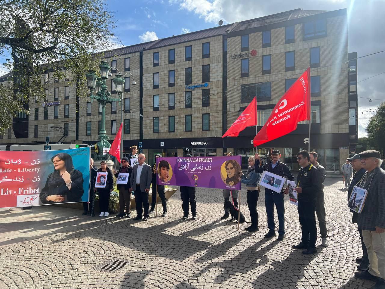 به پێی ڕاپۆرتهكان، ئاکسیونەکە بە خولهكێك بێدەنگی بۆ رێزگرتن لە گیانبەختکردووانی شۆرشی ژینا دەستیپێکرد، دواتر پەیامی هاوبەشی حزبە رۆژهەلاتیەکان بە سێ زمانی کوردی،سوئدی و فارسی پێشکهش کرا، هەروەها شادی حەیدەری ئەندامی حیزبی سۆسیال دیمۆكراتی سوئد بە نوێنەرایتی کومیتەی ژنانی سۆسیال دیمۆكراتی وڵاتی سوئد وتارێکی بە زمانی سوئدی پێشهکش کرد و پاشان هاوڕێ کاوە ئەحمەدی بەشی کوردیەکەی پێشکەش کرد . پاشان شاعری بەڕێز کاک ئەحمەد بازگهر چەند شێعرێکی پێشکهشی بهشداربووانی ئاكسیۆنهكه کرد وله كۆتاییدا ئاكسیۆنهكه به وتنهوهی سروودێك له لایهن هونهرمهند ئهسعهد مهریوانی، كۆتایی پێ هات.