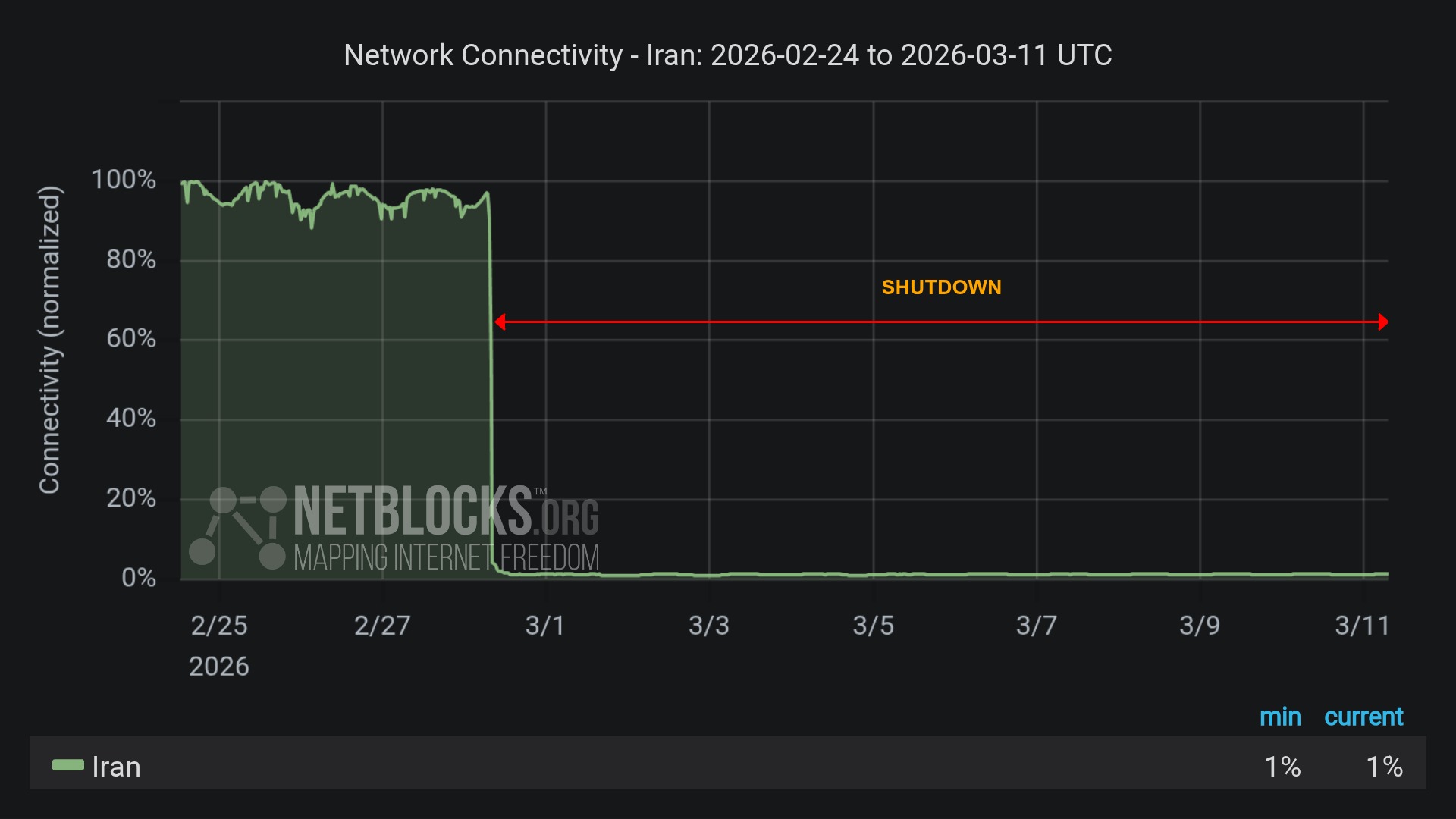 بەپێی ڕاپۆرتەکان، ڕێکخراوی “نێت بلاکس” کە دۆخی ئینتەرنێت لە جیهاندا چاودێری دەکات، ڕایگەیاندووە پچڕانی ئینتەرنێت لە ئێران پاش ٢٦٤ کاتژمێر پێی ناوەتە ناو ڕۆژی دوازدەهەمی خۆیەوە.
