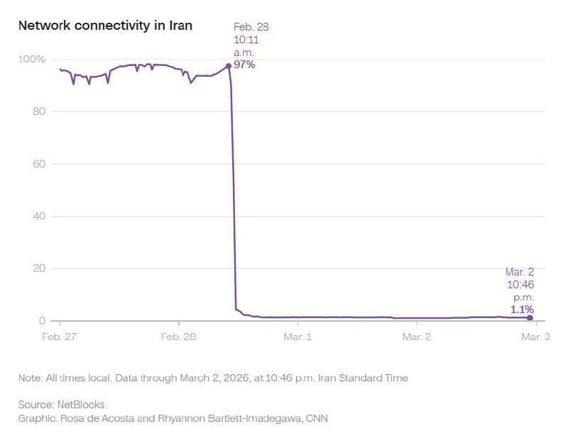 بەپێی ڕاپۆرتەکان، دەستڕاگەیشتن بە ئینتەرنێت لە سەرانسەری ئێران بە شێوەیەکی کتوپڕ لە نزیکەی ٩٧ لە سەد بۆ نزیکەی سفر دابەزیوە و بە تەواوی پەیوەندی ئۆنلاین لە نێوان ئێران و جیهان پچڕاوە.