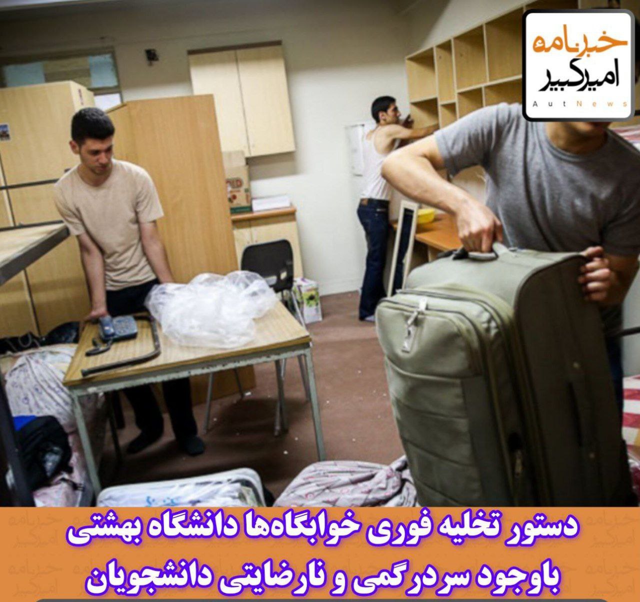 بهپێی زانیارییهكان، سهرۆكی زانكۆی بهههشتی بڕیاری داوه كه خوابگای ئهو زانكۆیه تا ڕۆژی ١٣ی پووشپهڕ دابخرێت، دهركردنی ئهو بڕیاره له حاڵێكدا كه خوێندكاران ئهبێ تا ئهو كاتهی دیاریكراوه پڕۆژهكانیان ڕادهست بكهن و ههندێك له خوێندكاران لهو ڕۆژهدا ئهزموونی كۆتایی ترمیان ههیه. بهوتهی خوێندكارانی ناڕازی، دهرفهتی ئهوهیان نییه لهو بهروارهی دیاری كراوه خوابگا ڕادهستی بهڕێوهبهرایهتی بكهن، بهڵام بهرپرسانی زانكۆ بایهخ به ئاوارهبوونی خوێندكاران پێش دهسپێكی ماوهی پشوودانی هاوین نادهن.