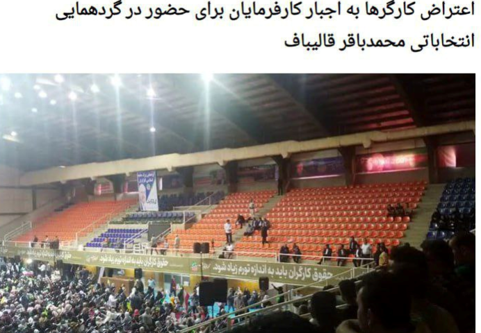 كرێكارانی یهكێك له شیركهتهكانی تاران كه بههۆی برانی كارهبا داخرابوو، ڕۆژی سێشهممه ٢٩ی جۆزهردان، له ئاست گواستنهوهی ئیجباریان بۆ بهشداری له كۆبوونهوهی تهبیلغاتی قاڵیباف ناڕهزایهتیان دهربڕی.